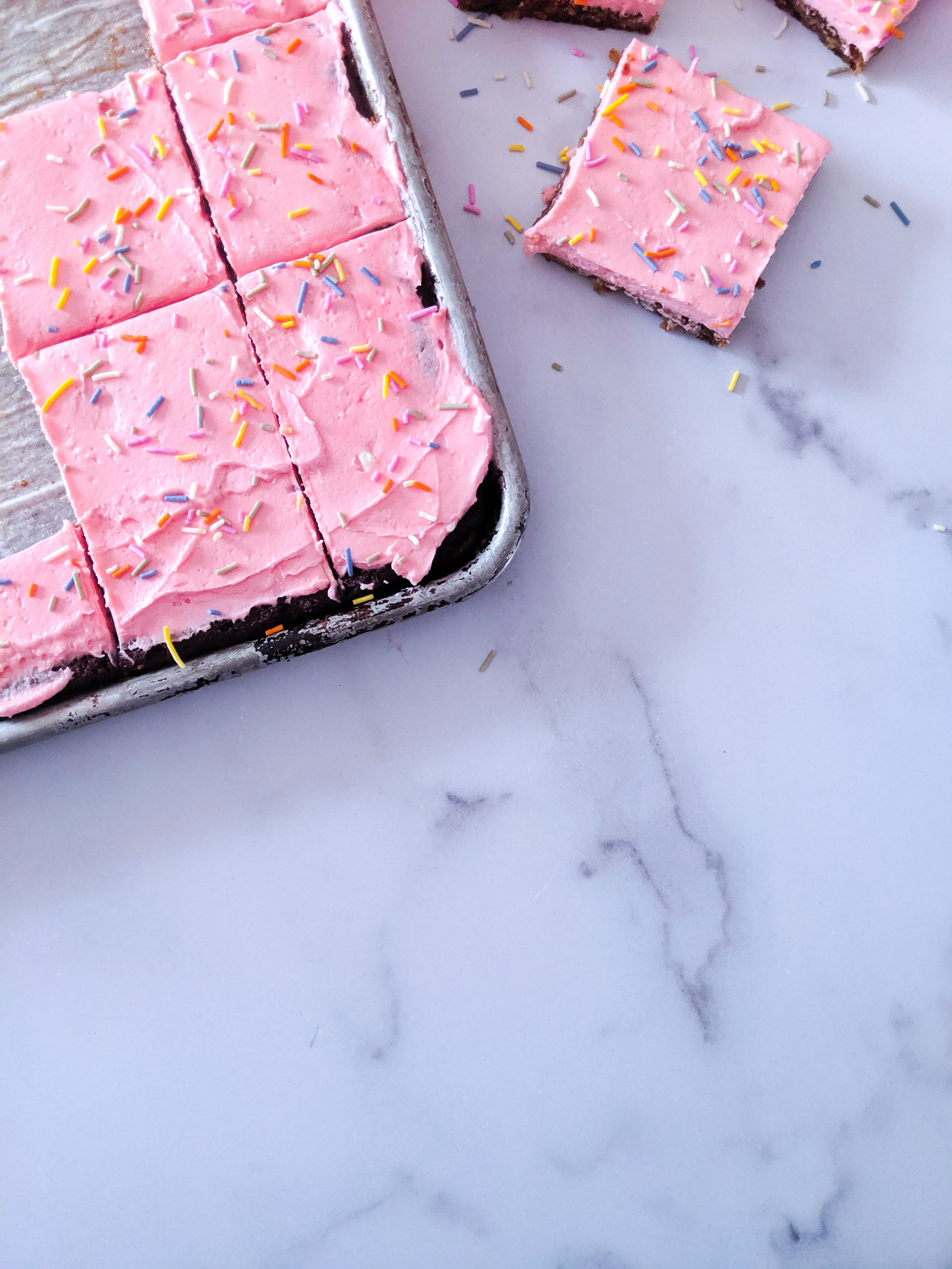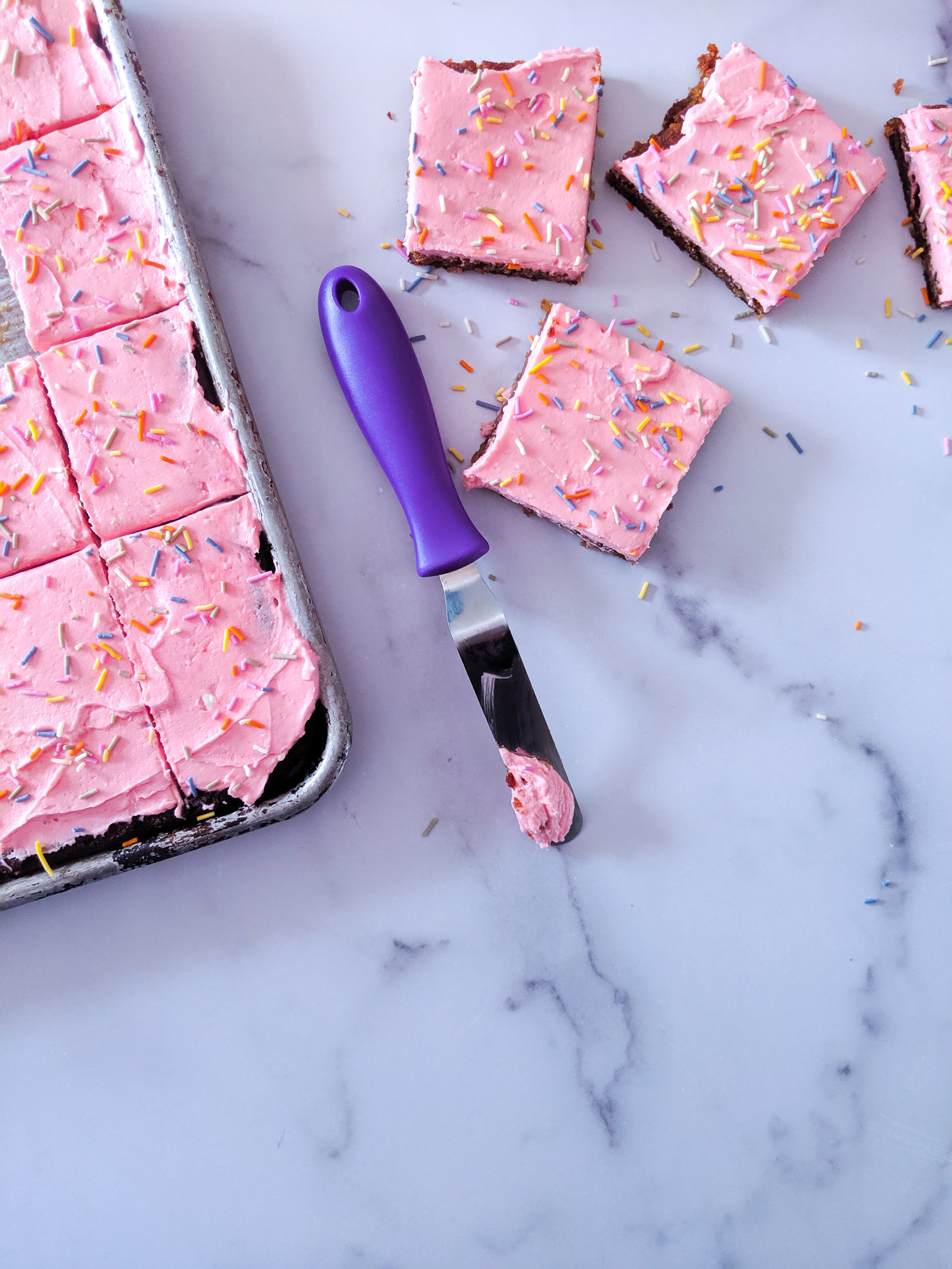 Spread the frosting over the cooled sugar cookie bars, then top with sprinkles.