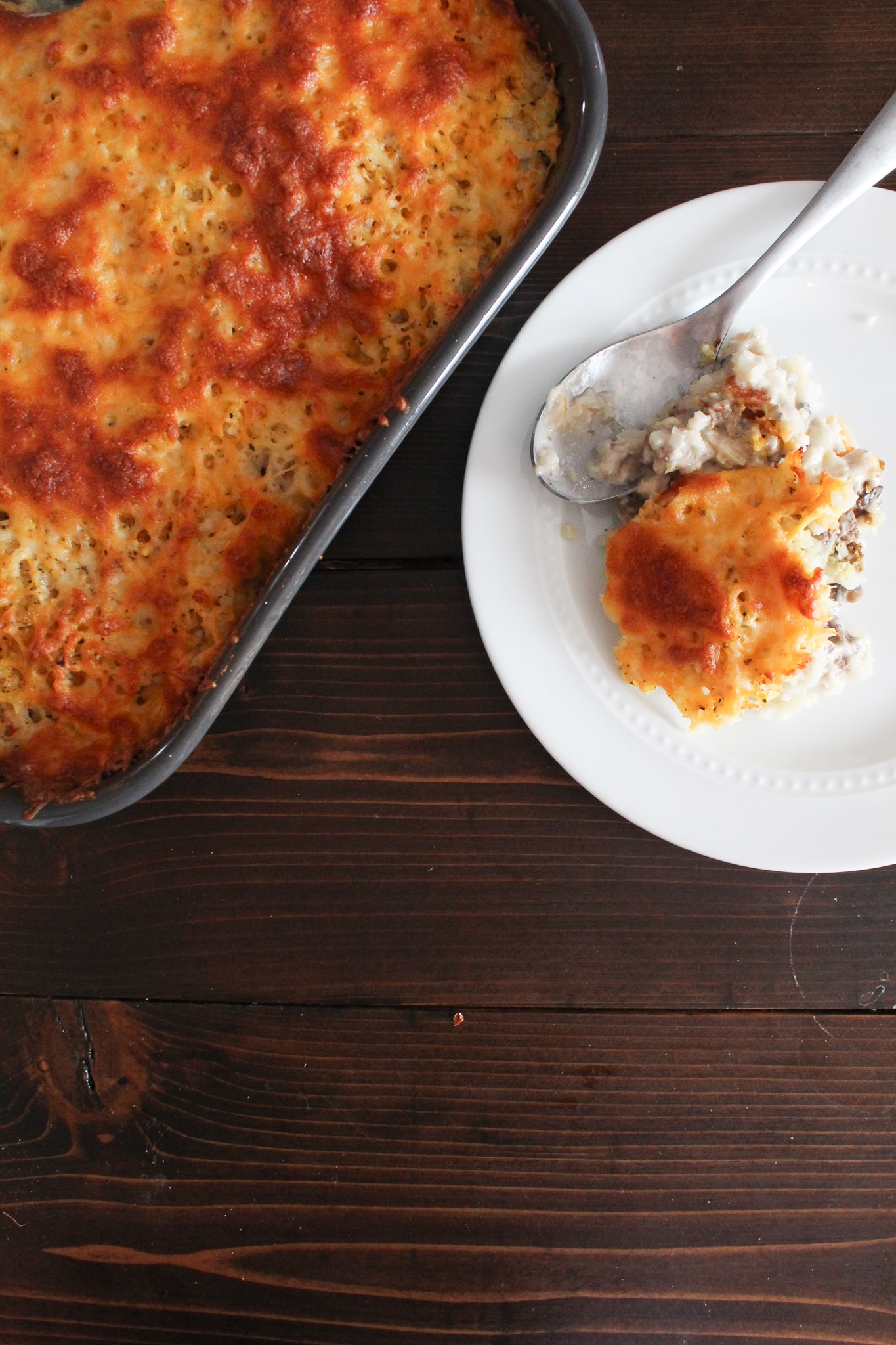 - Lightly grease a 9 inch baking dish. Mix the cooked ground beef, onion, garlic, cream of mushroom soup, and salt and pepper. Spread in the bottom of the baking dish.
