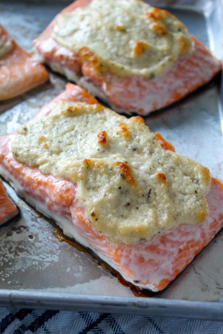 - Spread the parmesan mixture evenly over the salmon filets.